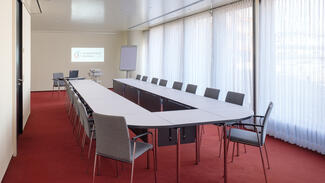 Der Konferenzraum in Oktagon-Bestuhlung verfügt über Dolmetscherkabinen und bietet Platz für bis zu 91 Teilnehmer.