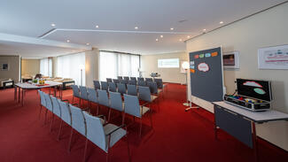 Der Konferenzraum in Oktagon-Bestuhlung verfügt über Dolmetscherkabinen und bietet Platz für bis zu 91 Teilnehmer.